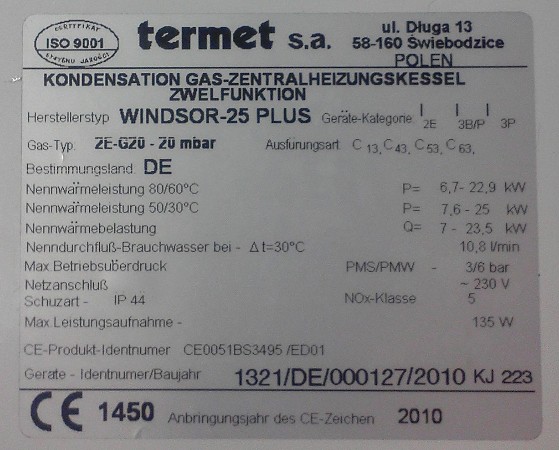 Typenschild-Beispiel der Brennwerttherme Windsor 25