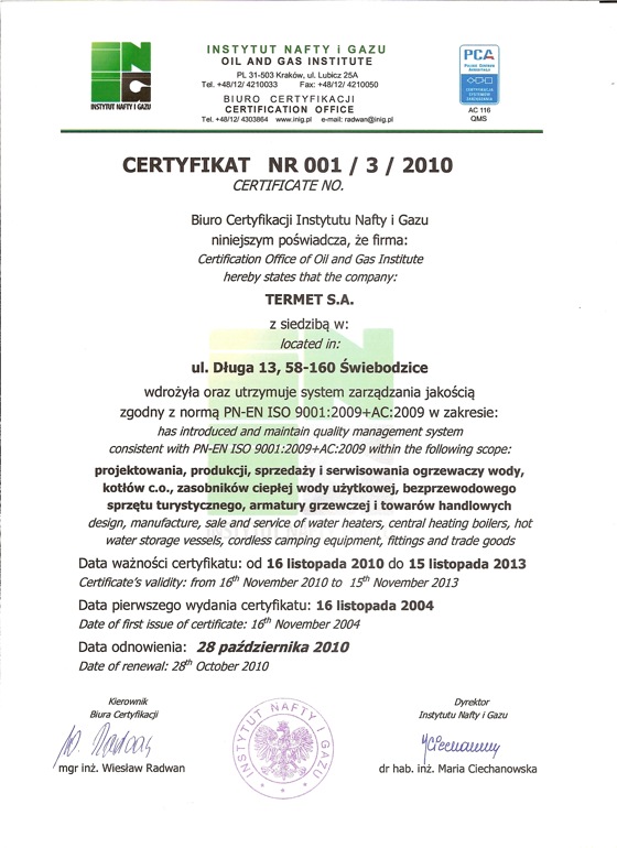 Design, Produktion, Service und Qualitätssicherung der Termet S.A wurden nach PN-EN ISO 9001 - 2009 folgende zertifiziert; erstmals in 2004, zuletzt im Oktober 2010